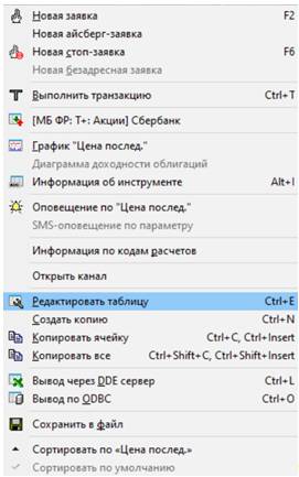 Для того чтобы добавить в ранее созданную «Таблицу текущих торгов» или удалить из нее финансовый инструмент или параметр, а также изменить место, которое они занимают в таблице, таблицу можно редактировать. Для того чтобы отредактировать уже существующую «Таблицу текущих торгов» поставьте курсор на любое поле таблицы и кликните правой кнопкой мышки один раз, у Вас откроется контекстное меню (рис. 2.19).