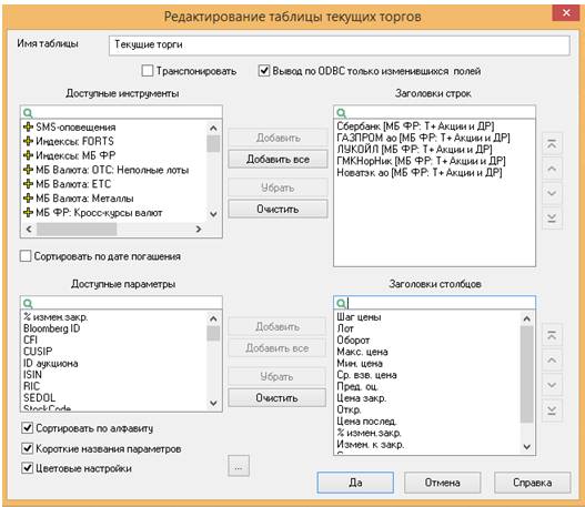 Формирование, редактирование и анализ таблиц в терминале QUIK
