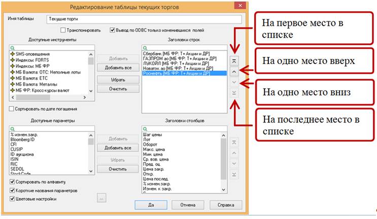 Также в «Таблице текущих торгов» можно менять очередность финансовых инструментов (заголовки строк) перемещая их вверх и вниз. Для этого используются кнопки со стрелками справа от списка «Заголовки строк» (рис. 2.21).