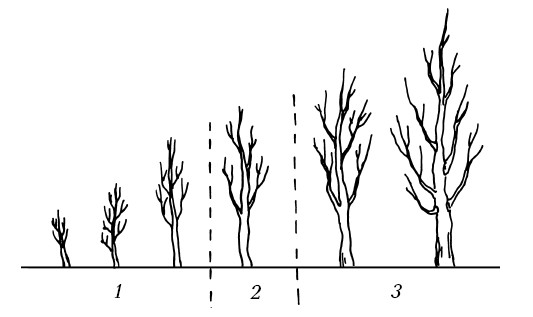 Рисунок 1. Виды деревьев по высоте: 1 – карликовые; 2 – среднерослые (полукарликовые); 3 – высокорослые