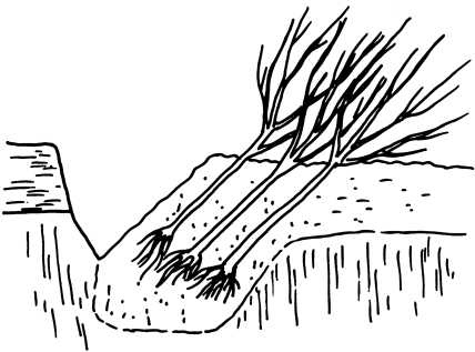 Прикапывают саженцы на участке в защищенном от ветра месте, где почва напоминает суглинки и плодородна. В песчаную почву предварительно добавляют торф и перегной (по 1–2 ведра на 1 м2). Удобрения вносят при перекапывании места прикопки. Саженцы размещают в яму шириной 50 см и глубиной 50–60 см, а ее длина зависит от количества саженцев. Яму располагают длинной стороной в направлении восток-запад. Корни внимательно осматривают и обломанные подрезают таким образом, чтобы срезанная поверхность была горизонтальной. Саженцы помещают в ямы наклонно, с опорой на южный край (рис. 3). Затем их корни присыпают рыхлой увлажненной почвой на четверть высоты ямы. После этого саженцы поливают и вновь засыпают почвой выше корневой шейки на 20–25 см. Посадку проводят очень аккуратно, чтобы не обломать корни и хрупкие ветки.