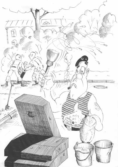 Хотя, конечно, и летом бывали удивительные задания. Как-то раз после какого-то очередного залёта мы красили бордюры. Казалось бы, ну и что там такого, бордюры-то покрасить? Но задачу нам поставили покрасить их ПОЛНОСТЬЮ. То есть мы вытаскивали ломом каждый бордюр, ставили на торец, полностью белили и закапывали обратно. Вот такая красота по-армейски.