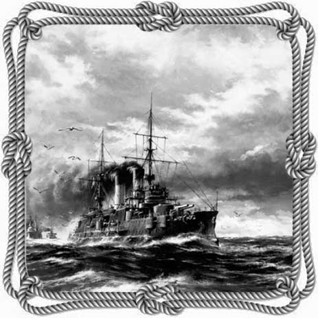 Броненосец «Орел» стоял в гавани, пришвартованный к внутренней ее стенке. С первого же взгляда, когда я только приблизился к нему, он поразил меня своими размерами. В сравнении с прежним старым моим крейсером этот казался великаном, мрачным красавцем. Весь он был черный, закован в броню крупповской стали, с массой надстроек. На баке укрепилась грузно вращающаяся башня, из амбразур которой выглядывали два длинных дула двенадцатидюймовых орудий, другая такая же башня угрожала с кормы. Кроме того, еще шесть башен расположились по бортам, с парой шестидюймовых орудий каждая. Главная разрушительная мощь заключалась именно в этой артиллерии. Двумя этажами ниже находилась батарейная палуба с 75-миллиметровыми скорострельными пушками, назначение которых было защищать броненосец от нападения миноносцев. Над палубой громоздились мостики: передний – в три яруса, с боевой рубкой, и задний – в два яруса. На них тоже были пушки, но уже совсем мелкие – 47-миллиметровые. Для того чтобы можно было в темноте разыскивать противника, мостики были вооружены ночными глазами электрических прожекторов. На середине судна возвышались две большие трубы, окрашенные в желтый цвет, с траурной каймой наверху. Между ними, на рострах, в специальных гнездах находились минные и паровые катеры, баркасы, шлюпки. Фок-мачта и грот-мачта соединялись антенной радиоаппарата. На каждой мачте виднелся марс – круглая площадка, обнесенная железными листами, откуда хорошо наблюдать за приближением неприятельских судов.