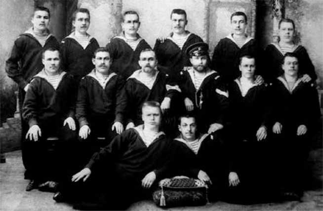 Алексей Новиков (сидит крайний слева) с товарищами с броненосца «Орёл» перед его уходом в боевой поход в Тихий океан. Осень 1904 г