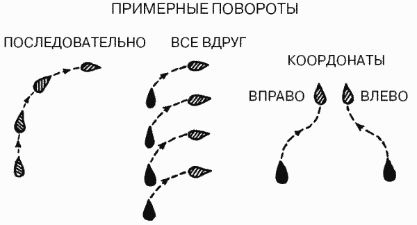 Повороты производятся по сигналам с флагманского корабля для перестроения эскадры из одного строя в другой (см. строй) и для изменения направления ее движения; выполняются они либо последовательно – корабли эскадры следуют движению головного, то есть идут как бы по его следу, либо все вдруг – каждый на своем месте, либо описывают коордонат – дугу вправо или влево.