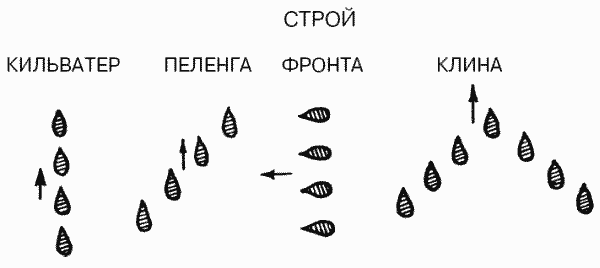 Строй – для удобства управления соединением или эскадрой в походе и в сражении корабли ходят в строю. Смотря по расположению судов, строи бывают: строй одной кильватерной колонны – корабли идут друг за другом, гуськом; строй пеленга – корабли идут уступами влево или вправо; строй фронта – корабли идут шеренгой, рядом друг с другом; строй клина, образуемый из двух строев пеленга.