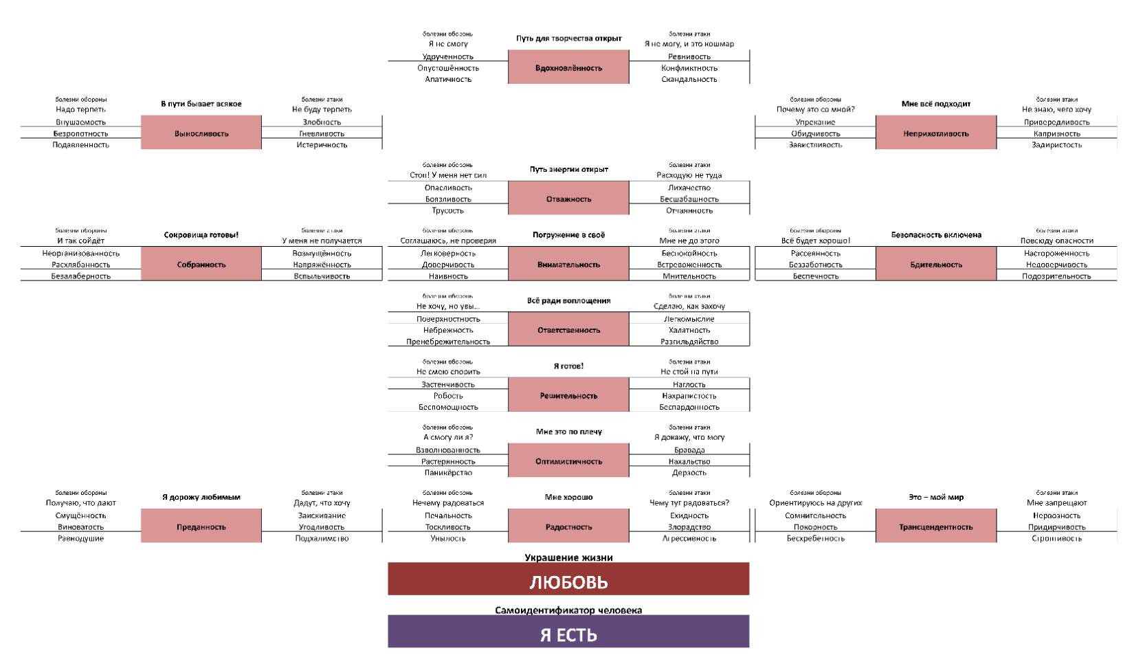 Первый – Любовь – это не направленное чувство, как принято считать. Любовь – состояние внутри, это растекающееся тепло при фокусировке на своих желаниях. Общение Ядра и Человека работает по принципу «приёмник – передатчик» – Ядро постоянно издаёт сигнал, а Я человека его принимает. Когда Вы концентрируетесь на том, кто Вы есть (мы привыкли говорить: «На том, что я люблю»), то тут же ощущаете тепло внутри себя – это и есть Любовь. Именно отсюда появилось: «Я люблю себя». Точно будет: «Я испытываю ЛЮБОВЬ (тепло, мир, покой, релакс, кайф), когда принимаю себя (живу в связке со своим Ядром)».