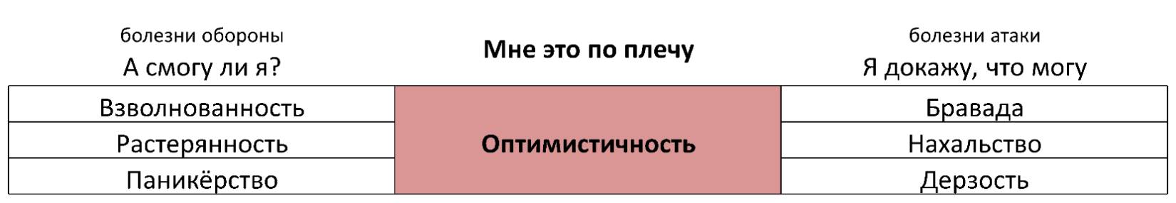 Помните, я писал о том, как формируется навык – шаг за шагом появляются знания и опыт, на основании которых пишется навык, а вместе с этим растёт и спокойствие, другими словами – растёт Вера. И по мере роста Веры, потребность в Оптимистичности уменьшается, потому что удовольствие теперь получается уже от реализации навыка, а Оптимистичность включится, например, на соревнованиях, где будет работать навык.