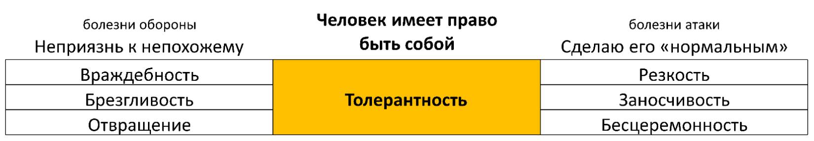 Толерантность (от лат. tolerantia – принятие) – механизм, позволяющий человеку проникнуться взглядами другого человека на жизнь (поведение, обычаи, ценности, убеждения, привычки и т.д.) для получения доступа к его сокровищам.