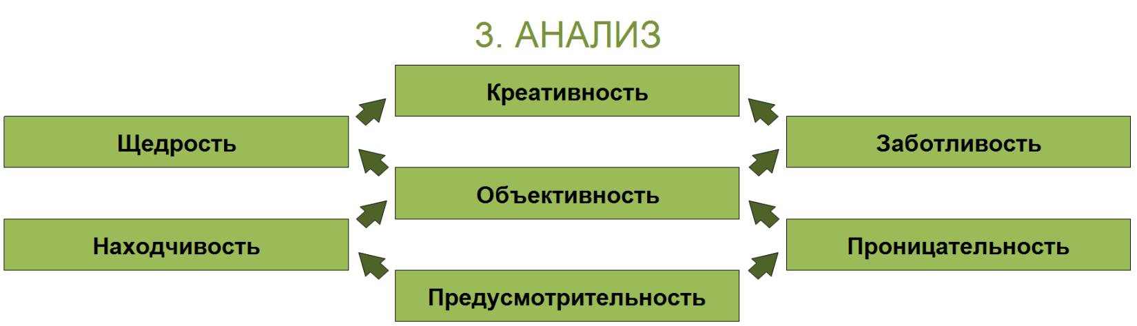 Следующими за ней идут два наиважнейших механизма, дающих уточняющие данные для анализа – Находчивость и Проницательность. Находчивость позволяет изыскать внутренние и внешние ресурсы для понимания возможности реализовать то, что обнаружила Предусмотрительность. А Проницательность поможет ей, уме видеть скрытую природу явлений и людей. Без этих двух столпов Анализ будет поверхностным, а значит план и стратегия реализации желания или создания товара пойдут совсем не тем путём.