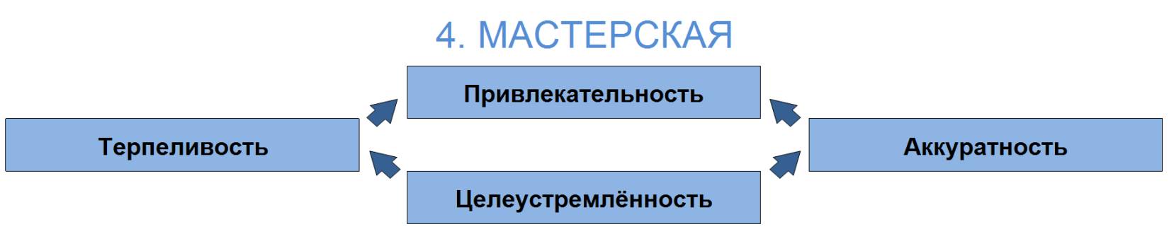Блок 4 – это Мастерская. Здесь создаётся стратегия воплощения; здесь ваяются промежуточные механизмы; здесь создаётся Ваш продукт. И если Вы будете, сидя за СВОИМ рабочим столом, постоянно оглядываться, думая, угождаете ли Вы близким, товарищам, нормам, правилам и традициям, что же Вы намастерите?