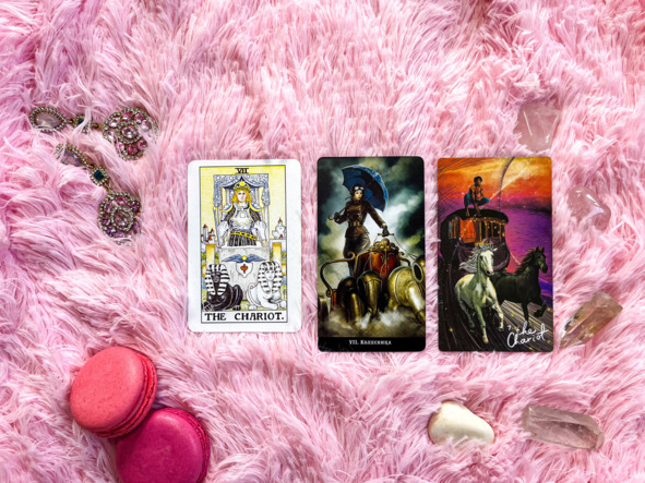 В классическом таро мы видим всадника, что управляет повозкой, запряженной двумя сфинксами (черным и белым). Его форма изобилует символами. За спиной – город, окруженный крепостной стеной, и река.