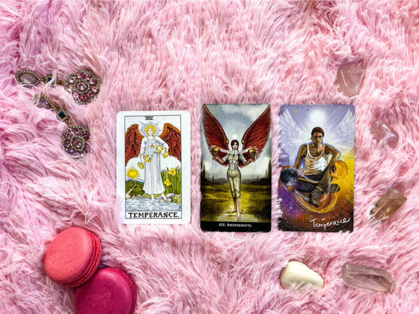 Посмотрите внимательно на карту – в ней есть всего по чуть-чуть, все стихии, которые пребывают в гармонии. В классическом таро на Умеренности изображен ангел, что одной ногой стоит на земле, другой – в воде. Во лбу – желтый металлический диск. Рядом – цветущие желтые ирисы. В руках он переливает воду из одной чаши в другую. Позади него красивый пейзаж и солнце, которое напоминает сияющую корону.