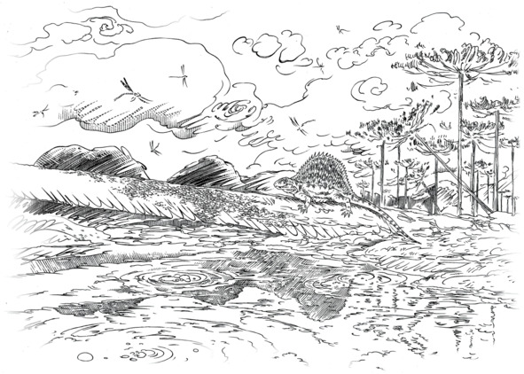 …Солнце уже перевалило за полдень, но молодой хищник все так же неторопливо брел через заросли, и в желудке его, увы, по-прежнему царила удручающая пустота. В застывшем воздухе явно ощущалось дыхание приближающейся бури, так что все мало-мальски крупные животные, составлявшие львиную долю диметродоновой диеты, уже стянулись к безопасным местам у склонов долины, поэтому одинокому охотнику решительно некем было удовлетворить свои плотоядные наклонности. Отчаявшись, он даже сунул морду в неглубокое озерцо, где, помнится, в период особо жестокой засухи ловил в грязи крупных пресноводных акул – ксенакантов – однако, как оказалось, в этом году водоем не успел даже толком обмелеть, и единственная замеченная рыбина, почувствовав тревожные колебания, немедленно ушла на глубину, где ее не сразу поймал бы и эриопс! Разочарованному диметродону же осталось лишь негромко фыркнуть, после чего, подгоняемый усиливающимся ветром, он был вынужден свернуть свою неплодотворную экскурсию и вслед за исчезнувшей добычей потянуться выше по течению, намереваясь переждать непогоду в одной из многочисленных пещер, выточенных дождями на горных склонах.