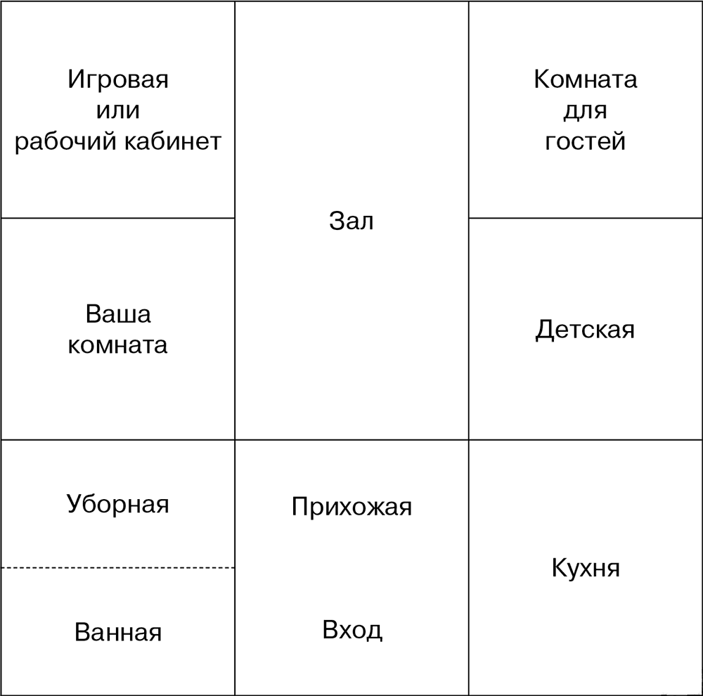 В правом верхнем углу располагается зона благосостояния. В ней лучше всего (по совету специалистов фэн-шуй) расположить деловое помещение, т. е. кабинет или игровую комнату. Вы можете сделать как одну большую, так и две маленькие комнаты, вход в которые будет либо из зала, либо из вашей спальни. Кроме того, еще одна дверь вам не помешает, если, конечно, она не будет сквозной. Если в этой комнате вы будете проводить вечера, занимаясь работой или детьми, то благоприятное влияние этой зоны не заставит себя ждать. В итоге можно добиться многого, а активизировав зону, вы сможете испытать на себе ее дополнительное влияние.