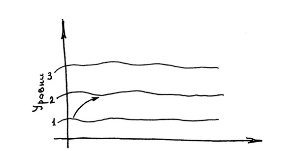 Когда вырабатывается первый уровень знания или первая волна, тогда возможен переход на уровень глубже (рис.11). Но чтобы это стало возможным, необходимо действовать, чтобы выработать энергию прежнего знания. Надо освободиться в действии, в работе.