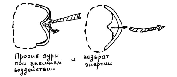 При внешней атаке в защитном слое возникает небольшой прогиб, что позволяет ограниченно воспринять воздействие, почувствовать его характер, а затем как при стрельбе из лука посильнее оттолкнуть (рис.3).