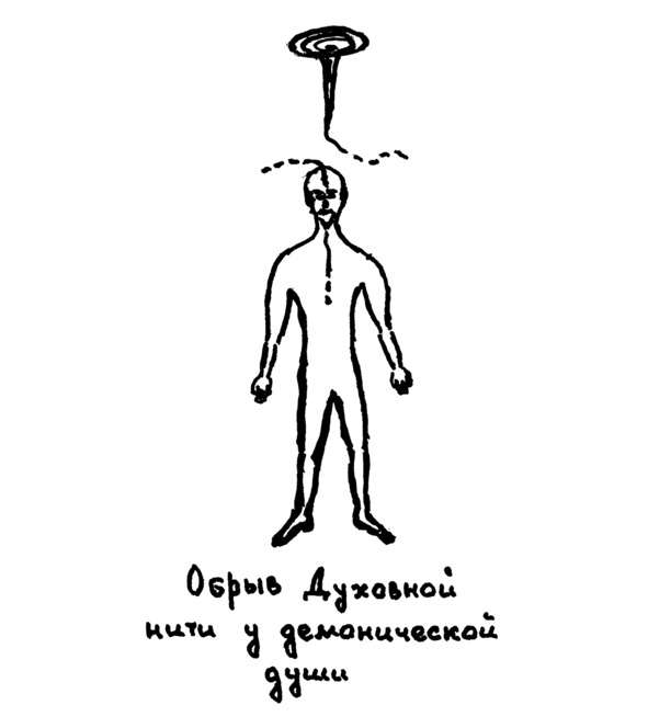 Поэтому нещадно, хищнически начинают использоваться для личного и группового потребления и обогащения земные ресурсы, флора и фауна, животные и люди. Всё становится для хищника энергетическим материалом и обретает ценность лишь как товар. Автономные, бездуховные хищники просто уничтожают окружающий мир или порабощают его, пока он может служить источником энергопитания. Вампирическая маскировка, обман и завлечение жертв в свои сети становятся уникальными по своей изощренности, что неудивительно, ведь это способ их существования. Иначе они обречены на вымирание как души, так как отказались от неиссякаемого Духовного Источника, от Отцовской Любви. Души становятся демоническими, когда Духовная нить обрывается (см. рис 8). Такие демонические души всё равно вымирают и рассеиваются, но успевают заразить многие другие души и увеличить или пополнить свои полчища, во главе которого стоит Сатана, которому подконтрольны все демонические силы Вселенной. В этом его сила и магия.