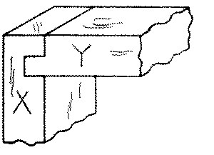 No. 28. A dovetail dado or gain is made by cutting one or both of the sides of the infitting member, Y, on an angle so that it has to be slid into place and cannot be pulled out sidewise. It is used in book-cases and similar work, in which the shelves are fixed.