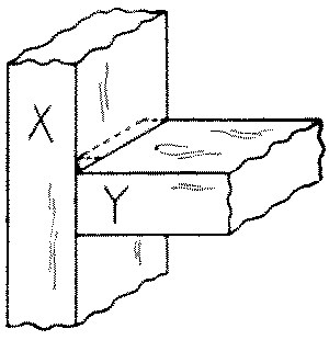 No. 29. A gain joint is a dado which runs only partly across one member, X. In order to make the edges of both members flush and to conceal the blind end of the gain, the corner of the other member, Y, is correspondingly notched out. In book shelves a gain gives a better appearance than a dado.