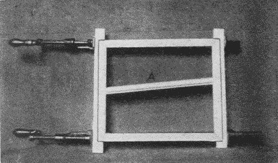 For gluing together at once all the members of a mitered frame, the device shown in Fig. 253 is convenient and is easily made. Out of two pieces of wood somewhat longer than the two end pieces of the frame, gains are cut of the exact length of the ends, as shown in the illustration. By applying two clamps lengthwise on the frame, all four joints may be glued together at once. If the frame does not come up square, it may be squared by means of a temporary brace, A, in Fig. 253.