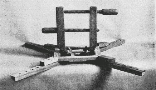 The device shown in Figs. 254 and 255, is also an easily made and efficient tool. At least the small pieces, which receive the corners of the frame, should be made of hard wood such as maple. It is self-adjusting but care must be taken not to buckle the parts of a narrow frame by over pressure. It is well to soap or oil the corner pieces to prevent their being glued to the frame.