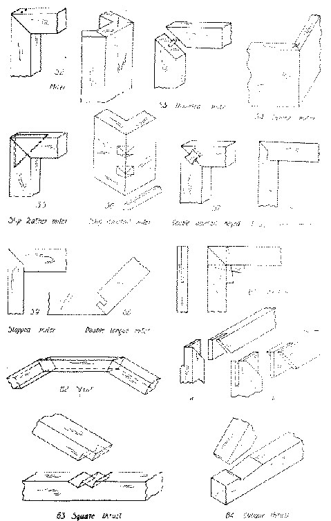 No. 60. A double-tongue miter is made by cutting on the adjoining edges tongues which engage in each other. It is used in high class joinery, on members that join lengthwise of the grain.