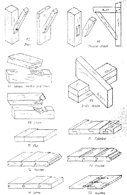 No. 66. A housed brace joint is a joint in which the brace is housed into the rectangular members except that the outer end of the mortise is cut at right angles and the inner end diagonally to receive the brace which is cut to correspond. It is much stronger than 65.