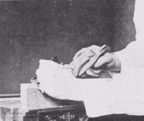 Thru chamfering is best done with a plane, Fig. 272. For this purpose the piece may be held in the bench-vise and the plane tipped to the proper angle, or the piece may be held in a handscrew which in turn is held in the vise as in Fig. 175, p. 101. The chamfers with the grain should be planed before those across the grain.