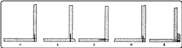 Reinforced bottom, Fig. 284, E. A plain or full bottom is sometimes covered by a base or cover strip to hide the joint and secure the bottom, as in tool chests. This strip may be mitered at the corners.