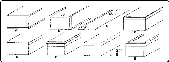 The lid may be boxed, Fig. 285, D, that is, portions of the sides may be affixed to the top. These extra pieces are a help to stiffen the top and to keep it from warping. A boxed top may have the top board flush with the sides, Fig. 285, E. The disadvantage of this is that the top may shrink and part from the sides and give a bad appearance. The overlapping top, Fig. 285, F, obviates this trouble of shrinkage and adds a decorative element. In this case the top may be glued on or screwed from below thru the side strips.