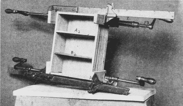 In gluing boxes together, it is a good plan to glue the ends and sides together first and to let these joints dry before gluing on the bottom and, in the case of a boxed top, Fig. 285, D, the top. Care must be taken to see that the sides do not bow under the pressure. To prevent this, one or more false, temporary partitions as A, B, in Fig. 286, of exactly the length to keep the sides straight, may be inserted. In gluing together boxes with rabbeted joints, Fig. 285, H, pressure should be applied in both directions. In gluing on the bottom of a box that is also to be nailed, the nails should be driven into the bottom first, so that the points just come thru. These points sticking into the sides will prevent the bottom from slipping when pressure is applied. It is often undesirable to have nail heads show, as in a top. In such a case, and also to prevent the top from slipping under pressure, a couple of small brads may be driven part way into the upper edges of the sides, the heads bitten off with the nippers, and points filed on the projecting portion.