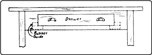 If there are two drawers, a double runner lies between, and is gained into the middles of the back rail and the stringer, and on it is a guide for both drawers, equal in width to the partition between the drawers. The drawers should run easily in their proper places. In order to insure this, the drawer should be slightly narrower than the opening which receives it. A little French chalk, rubbed on the sides and runners, makes the running smoother. Sometimes the opening for a drawer is cut out of the front rail, as in Fig. 296. In this case the drawer runners are supported between the front and back rails, into which they may be gained.