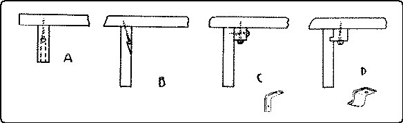 For fastening the top to the table rails, several methods are used. The top may be screwed to the rails by the screws passing thru the rails themselves either straight up, Fig. 297, A, or diagonally from the inside, B, or thru blocks or angle irons, C, which are screwed to the inside of the rails, or thru buttons, or panel irons, D, which are free to move in a groove cut near the top of the rail. The last method is the best because it allows for the inevitable shrinkage and swelling of the top.