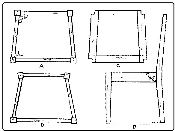 The two back legs, may, for the purpose of simplification, be kept parallel to each other and at right angles to the seat rails between them, as in Fig. 298, A, and not at an angle as in B. The joining of the back will then offer little difficulty. The principal difficulties lie in the facts that for comfort and appearance the back of the chair should incline backward both above and below the seat, and that the back of the seat should be narrower than the front. By keeping at right angles to the floor the part of the back legs which receives the seat rail, the side seat rails will meet the back legs at a right angle in a side view, Fig. 298. The back legs should be slightly shorter than the front legs, as shown in D.