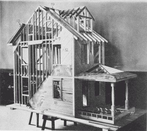 The balloon-frame house is a typical form of framed construction, Fig. 300. The essential parts of a balloon-frame are: