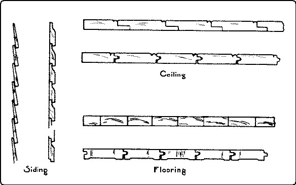 In flooring, Fig. 301, the boards are made narrow so as to reduce the size of openings at the joints when they shrink, and also to reduce the tendency to warp. They may be laid side by side as in the cheapest floors, or matched to close the joint. For difference between slash- and comb-grain flooring, see Fig. 55, p. 42.