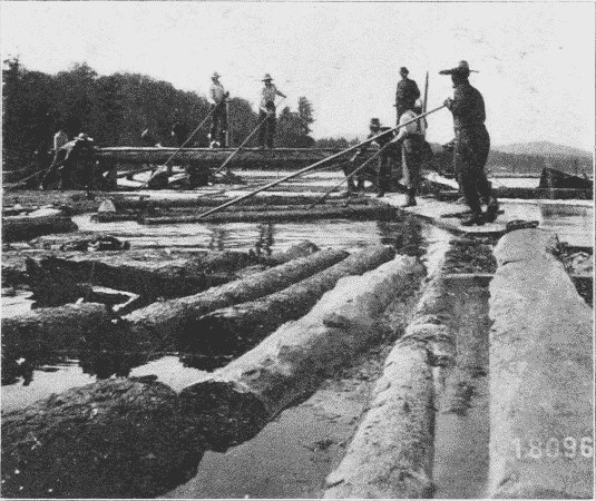 Thus by one means and another, the logs are driven along until caught by a boom, Fig. 21, which consists of a chain of logs stretched across the river, usually at a mill. Since the river is a common carrier, the drives of a number of logging companies may float into the mill pond together. But each log is stamped on both ends, so that it can be sorted out, Fig. 22, and sent into the boom of its owner.