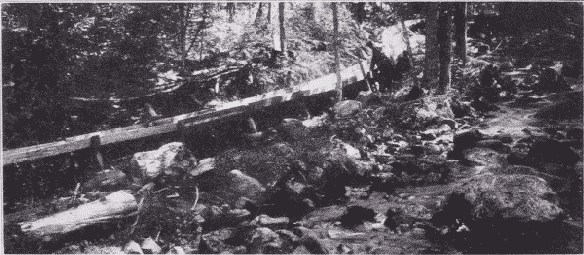 MECHANICAL METHODS IN LUMBERINGThe operations described above are those common in the lumber regions of the northeast and the Lake States. But special conditions produce special methods. A very effective device where streams are small is the flume, Fig. 23. This is a long wooden trough thru which water is led, and the logs floated end on. It is sometimes many miles long; in one case in California twenty-five miles.