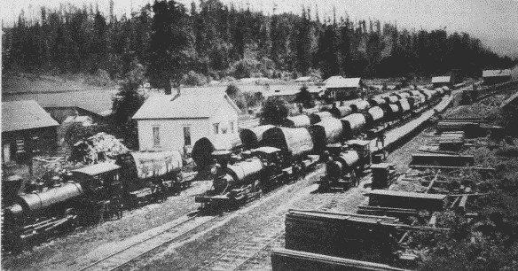 Sometimes these donkey engines are in relays, one engine hauling a turn of logs to within reach of the next one, which passes it on to the next until the siding is reached.