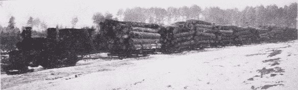 Another method of traction where the woodland is open enough is with a traction engine. The ones employed have sixty to one hundred horse power. The great logs may be placed on wood rollers, as a house is when moved, or the logs may be hauled in on a low truck with broad wheels. The "tractor" hauls the log direct to the railway if the distance is not too great.