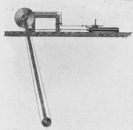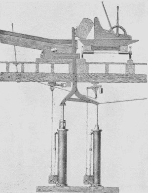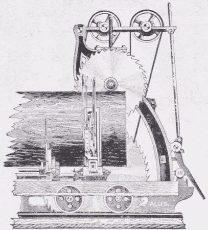 The saw-carriage, Fig. 42, is propelled forward and back by a piston running in a long cylinder, into either end of which steam can be turned by the operator.