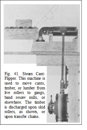 After the logs have entered the mill, they are inspected for stones lodged in the bark, and for spikes left by the river men, and then measured. Under the log-slip is the steam "flipper" or "kicker," Fig. 38, by means of which the scaler or his assistant, throwing a lever, causes the log to be kicked over to one side or the other, on to the log-deck, an inclined floor sloping toward the saw-carriage. Down this the log rolls until stopped by a log-stop, or log-loader, Fig. 39, a double-aimed projection, which prevents it from rolling on the carriage till wanted. This stop is also worked by steam. By letting the steam into the cylinder which controls it, one log is rolled over on the carriage and the next one held. The log on the carriage is at once "dogged," that is, clamped tight by iron dogs, the carriage is set for the proper cut, and moves forward to the saw which cuts off the first slab. The carriage is then "gigged" or reversed. This operation offsets the carriage one-eighth of an inch so that the log returns entirely clear of the saw. In the same way two or three 1" boards are taken off, the dogs are then knocked out, and the log canted over half a revolution. This is done by means of the "steam nigger," Fig. 40, a long, perpendicular toothed bar which comes up thru the floor, engages the log, and turns it over till the sawn side comes up against the knees of the carriage. The log is dogged again and a second slab and several boards are taken off. The log or "stock" as it is now called, is 10", 12", 14", or 16" thick; the "nigger" then gives it a quarter-turn, leaving it lying on a sawn side. It is dogged again, and all sawn up except enough to make a few boards. This last piece is given a half-turn, bringing the sawn side against the knees, and it is sawn up. Each board as it is sawn off is thrown by the board-flipper or cant-flipper,3 Fig. 41, on to the "live rollers," which take it to the next process. Another log comes on the carriage and the process is repeated.