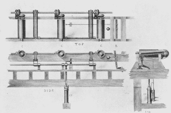 Fig. 44. Automatic Steam Transfer for Timber, Lumber and Slabs. The boards are carried along by the cylinders, CCC, until they hit the bumper, B. This movement admits steam to the cylinder, CY, which raises the revolving chains or skids, which transfers the stock sidewise to other live rollers as required.