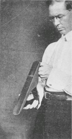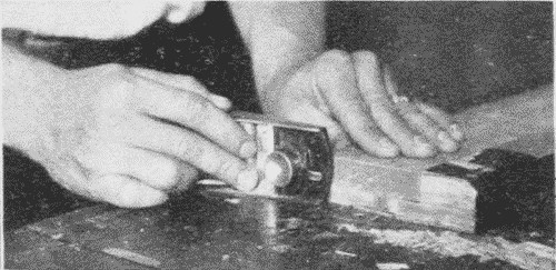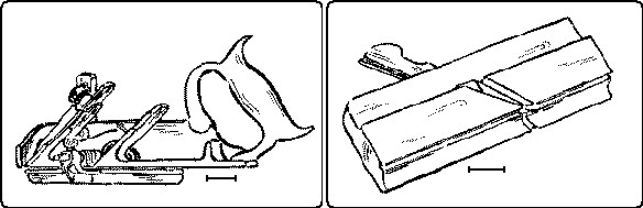 The scratch-plane, Fig. 111, has a toothed cutter which scratches fine lines along its course. It is used to roughen surfaces of hard wood which are to be glued together, for otherwise the glue would not adhere well. Some tropical woods are so hard that their surfaces can be reduced only by a scratch-plane. It is also useful in preparing the surface of a very cross-grained piece of wood which cannot be planed without chipping. By first scratching it carefully in all directions, it can then be scraped smooth. It is also called a scraper-plane, because accompanying the plane is a scraper which can be inserted in the same stock and inclined at any required angle. This plane-stock prevents the scraper from unduly lowering some portions of the surface. See also veneer-scraper, p. 92.