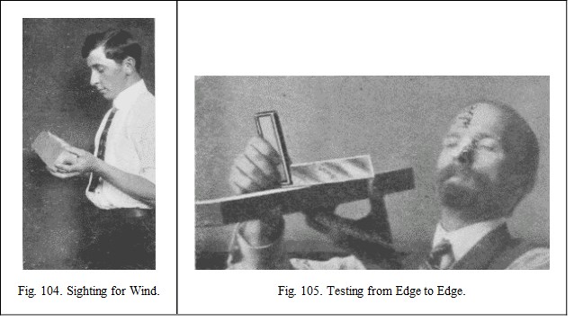 If there be any "wind" or twist in the board, this should be discovered first of all. This may be done roughly by sighting across the broad side of the board, Fig. 104, and more accurately by the use of "winding sticks," see Fig. 205, p. 113. Or the surface may be tested with the plane itself by tilting the plane on its long corner edge, and resting it on the board, while the worker looks between the board and the plane toward the light. It is evident that the plane must be turned in various directions to test for wind, and that a board only as long or as wide as the plane is long can be tested in this way. The try-square or any straight edge may be used for the same purpose, Fig. 105. If there be any wind in the board, this should at once be taken out of one face by planing down the high corners.