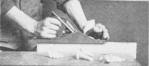 In using the bench-hook the piece to be block-planed is placed with the working edge against the block, with the end to be planed to the right and flush with the edge of the bench-hook, in which position it is held with the left hand. The block-plane, held in the right hand, is placed on its side on the bench facing toward the work. In planing, the left hand holds the work firmly against the block of the bench-hook, pressing it somewhat to the right against the plane. The right hand holds the side of the plane flat on the bench and presses it to the left against the bench-hook and work. Held in this position the plane is pushed forward and back until the end is smoothed. Considerable practice is necessary to handle the block-plane well.