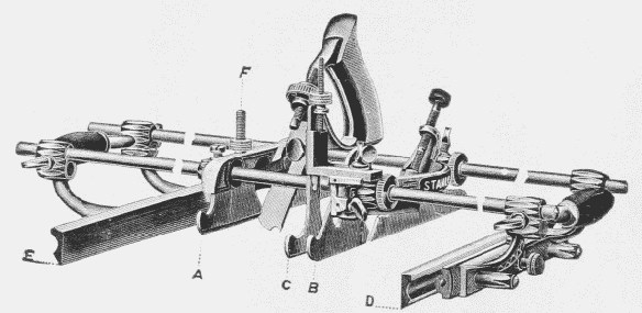 The Use of the Universal Plane. Insert the proper cutter, adjusting it so that the portion of it in line with the main stock, A, will project below the sole the proper distance for cutting.
