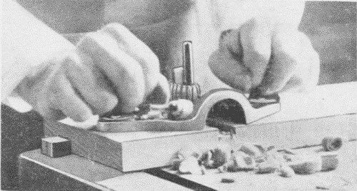 In use, Fig. 152, the scraper may be either pushed or pulled. When pushed, the scraper is held firmly in both hands, the fingers on the forward and the thumbs on the back side. It is tilted forward, away from the operator, far enough so that it will not chatter and is bowed back slightly, by pressure of the thumbs, so that there is no risk of the corners digging in. When pulled the position is reversed.