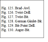 German gimlet-bits, Fig. 128, have the advantage of centering well. The size is indicated on the tang in 32nds of an inch. They are useful in boring holes for short blunt screws as well as deep holes. They cannot be sharpened readily but are cheap and easily replaced.